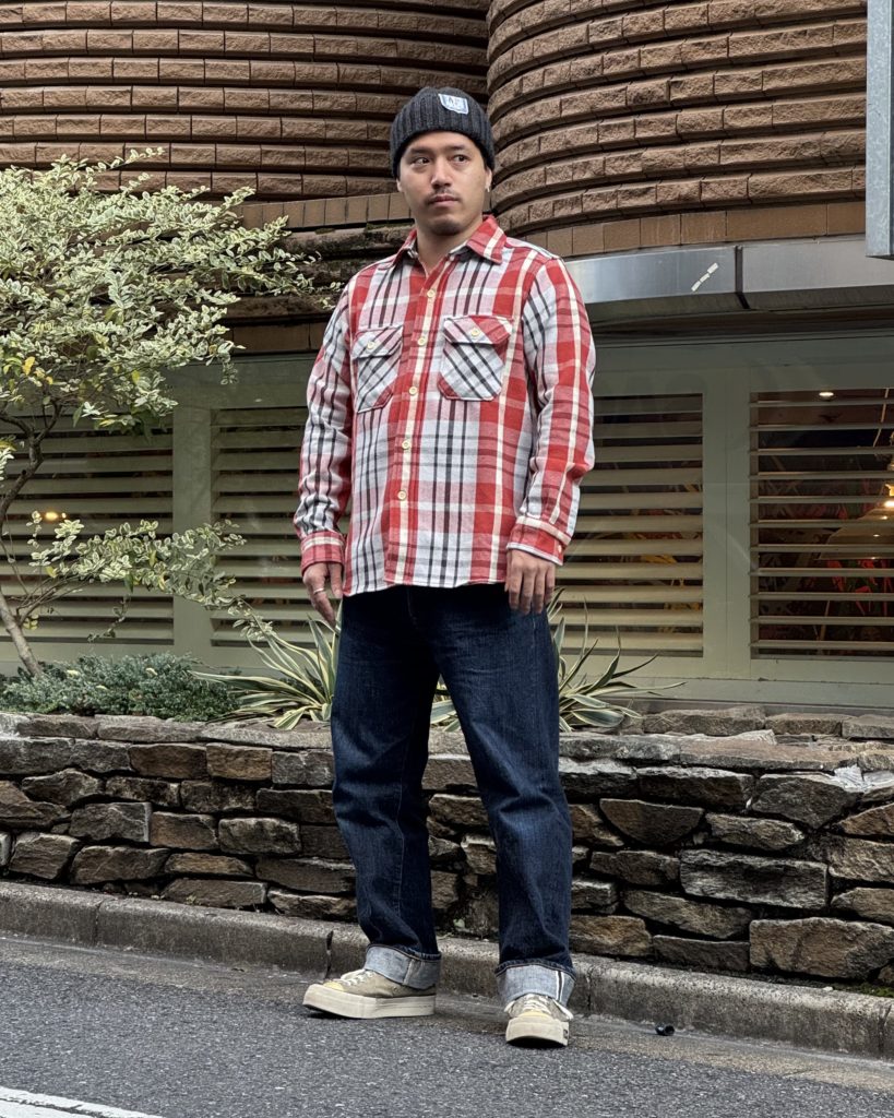 デニムにネルシャツ。