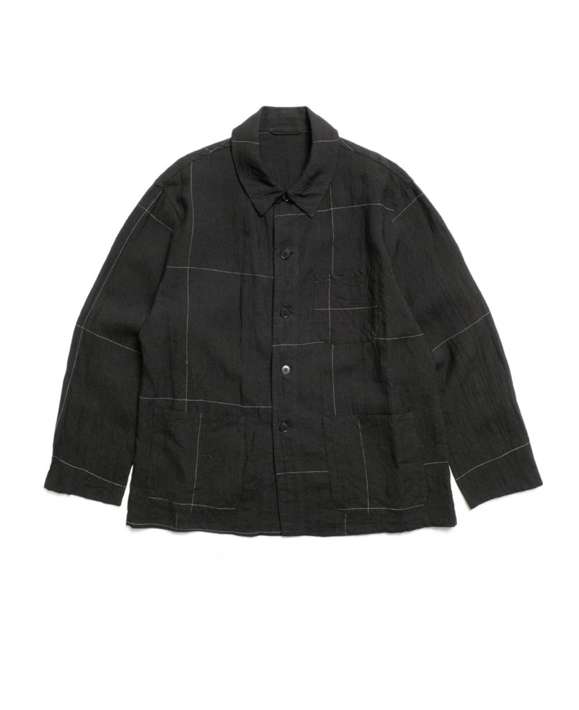 先染めのリネン糸をドイツの旧式織機にて高密度に織り上げた、大きなウインドウペーン(一色のラインが交差して大きな格子を作っている柄)の生地を使用。