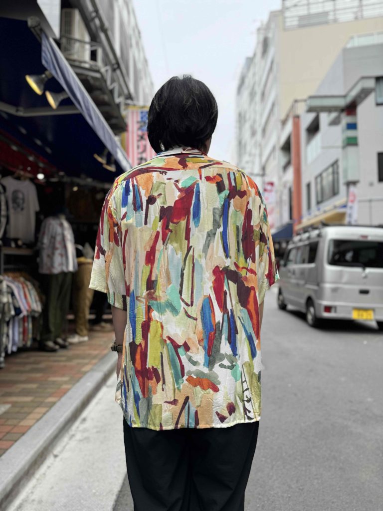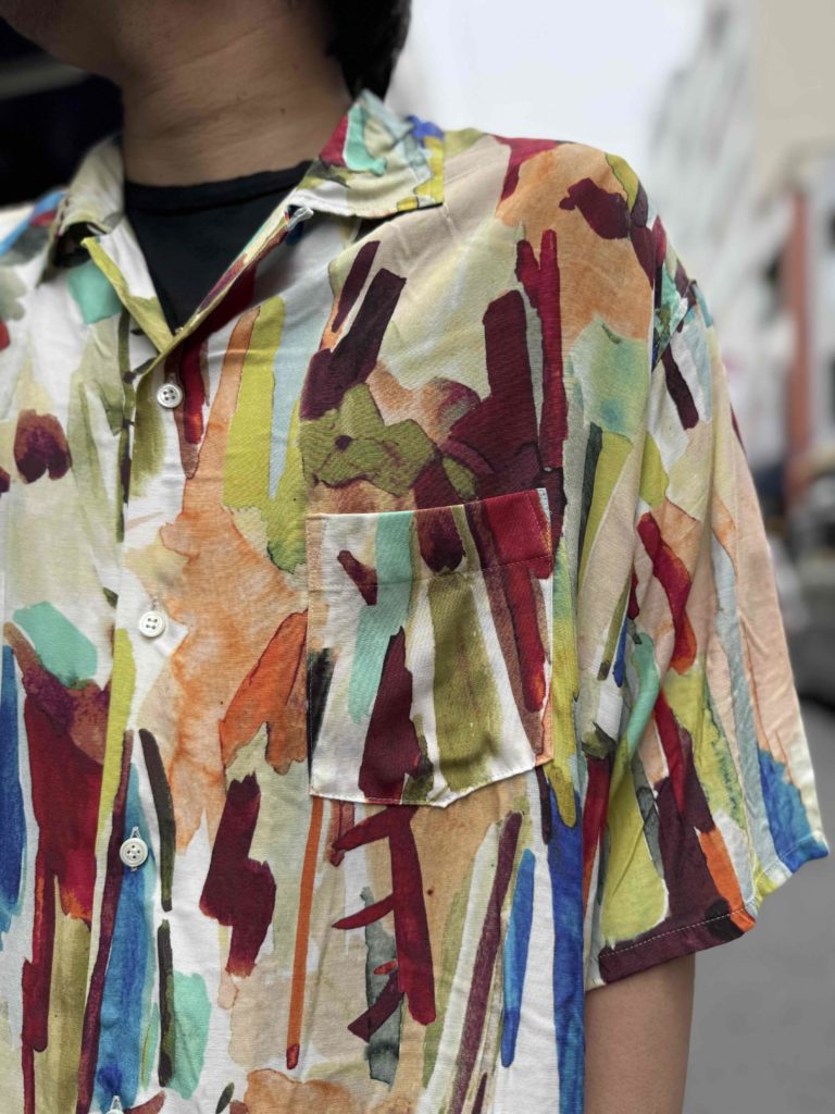 トルコ「IPEKER(イペカ)」社のキュプラ・レーヨン生地を使用した、水彩抽象画的美しい色彩をプリントした夏を楽しむ半袖開襟”タイヨウノ”シャツ。