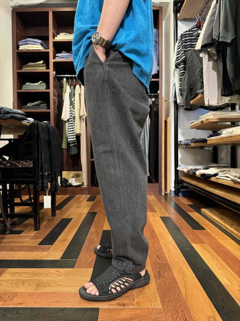 カバーリングコアヤーンデニムを使用したワイドテーパードデニムパンツ。