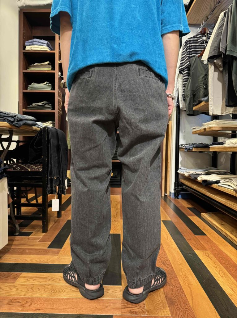 ヒップとワタリにボリュームを持たせ、裾にダーツを入れた丸みのあるワイドテーパードカット。