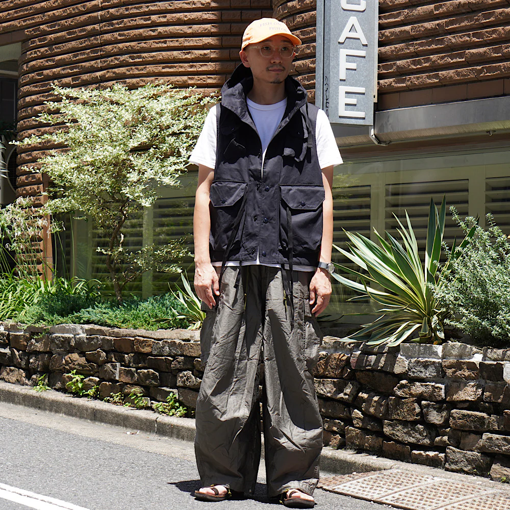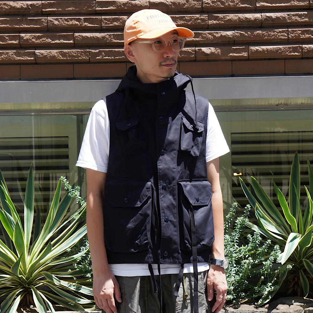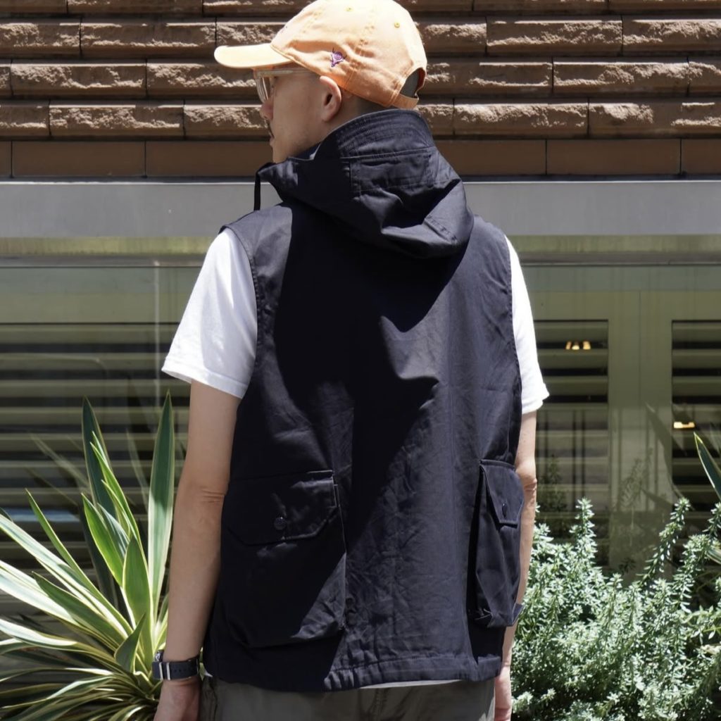 大きな立体的なポケットやサイドポケット、スナップボタンやドローコードなど、機能的でアクティブなディテールを多数装備したフィールドベスト。