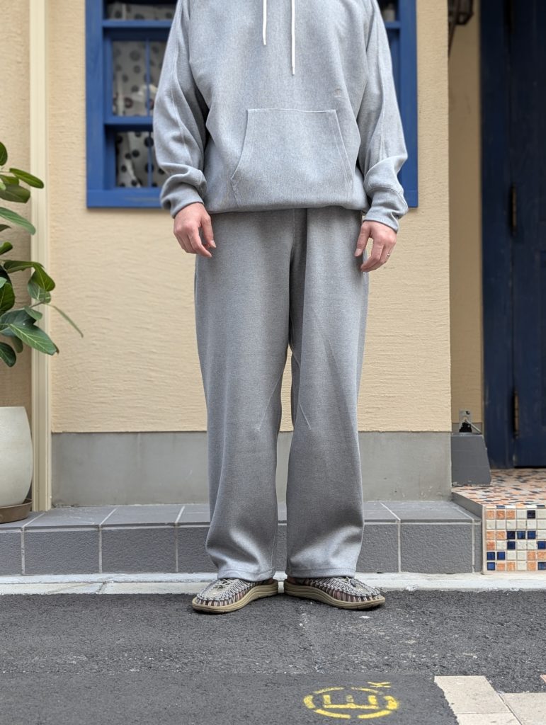 オリジナルダブルフェイス素材を使用したワイドストレートカットのスウェットパンツ。