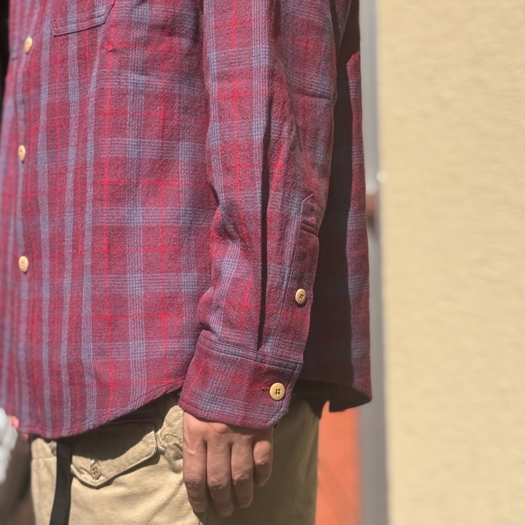 毛麻の混合素材で織り上げらたチェック柄の生地とオリジナルの水牛ボタンを使用したシャツです、