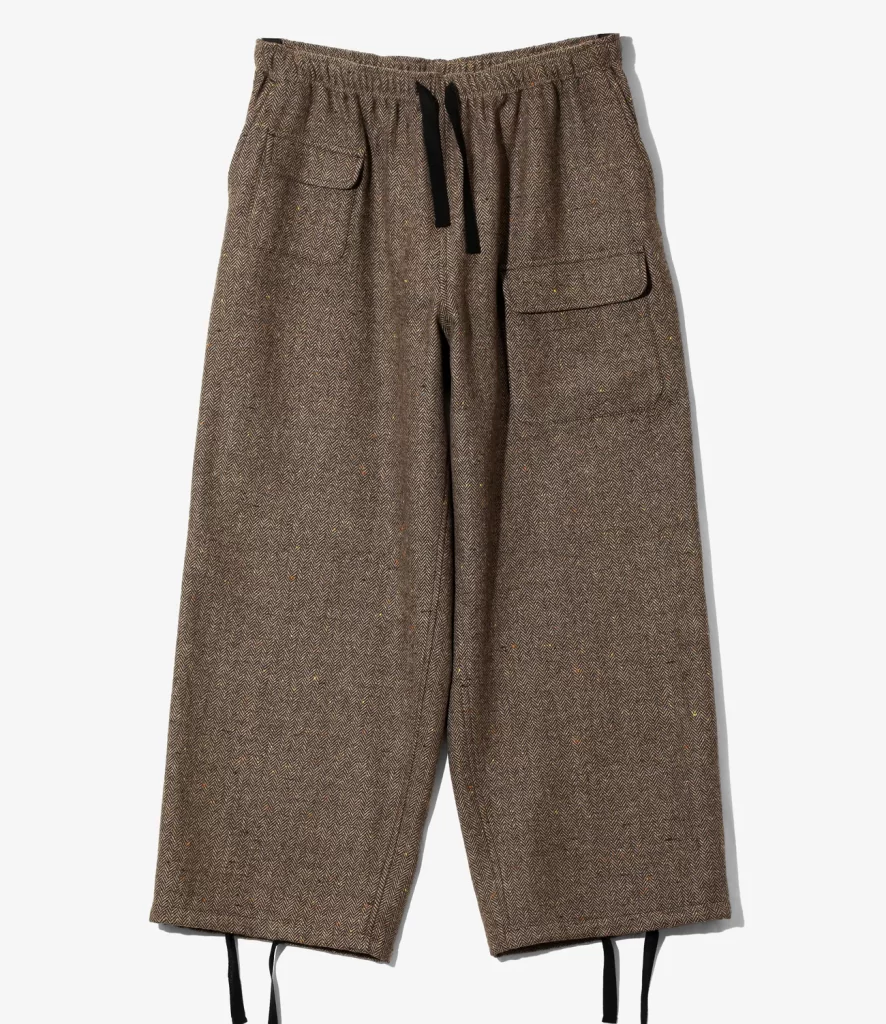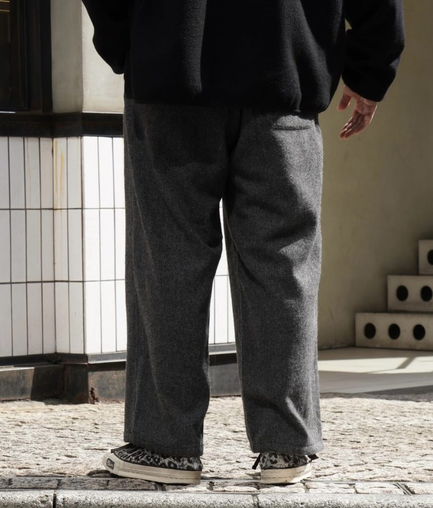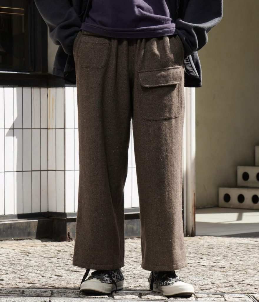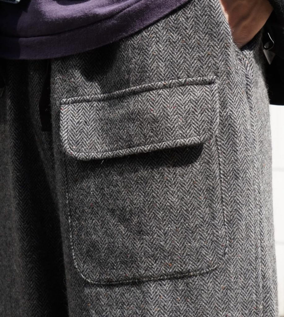 リラックス感のあるワイドシルエットに、ウエストとヘムのストリング仕様、アシンメトリックに配置されたパッチアンドフラップポケットが特徴的な一本。