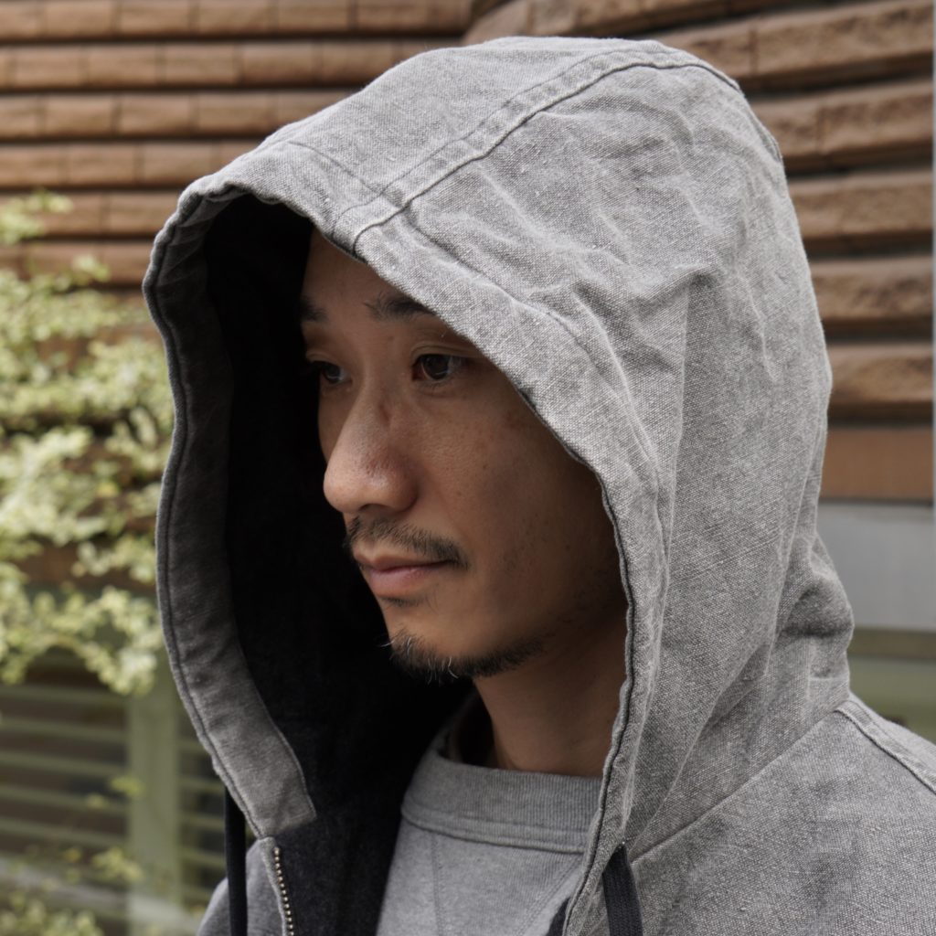 日本の伝統的な染料、墨にて染めあげ、仕上げでテンションを掛けずに何度も洗い込んで膨らみを持たせています。