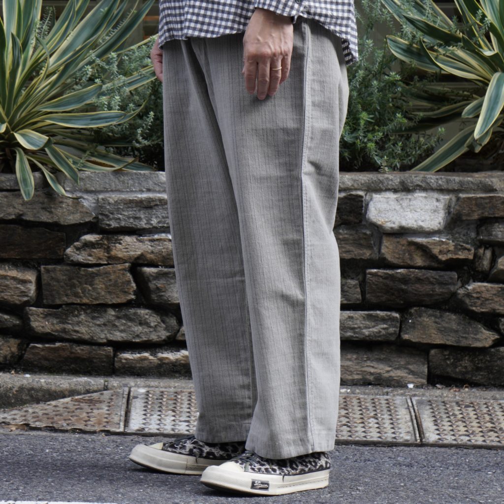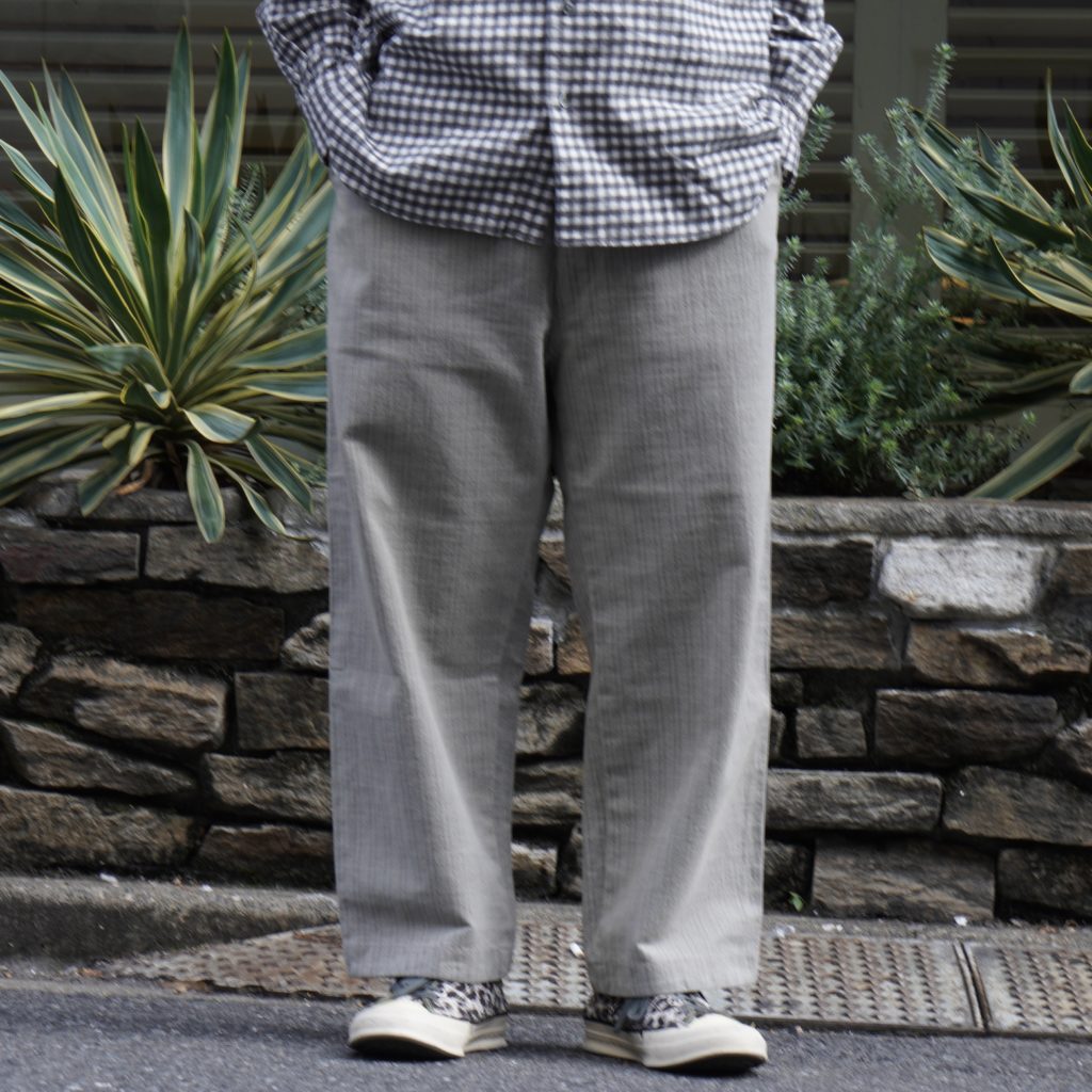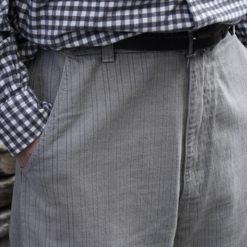 撚り杢糸で奥行きある柄を表現し、強めのフェード加工で黒〜グレーに色落ち。