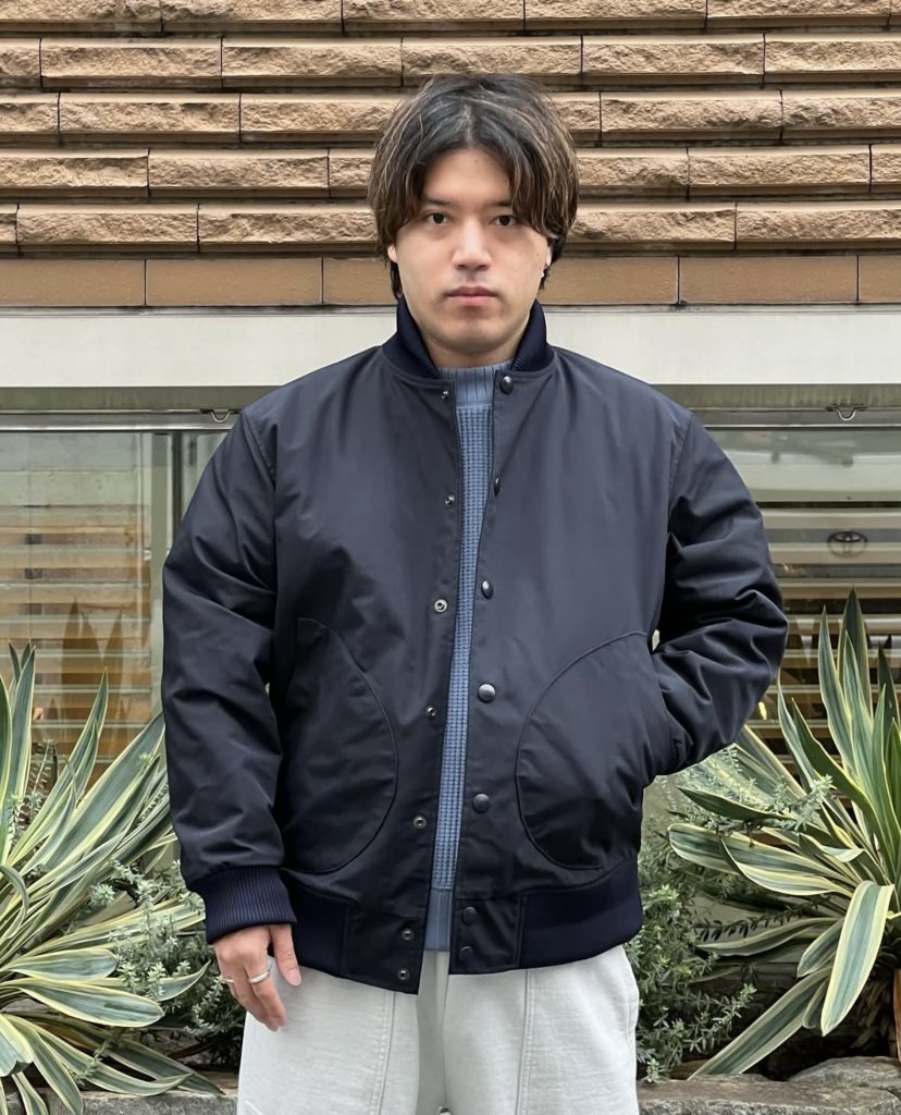 ポリエステルフィラメント糸で織り上げたオックスフォード織りの布帛素材を使用したアワードジャケット。