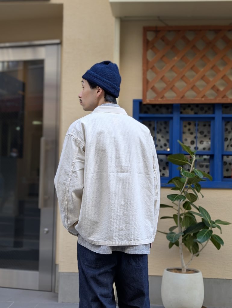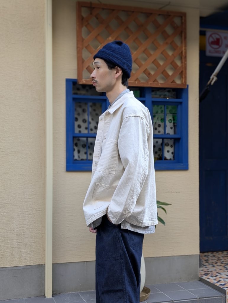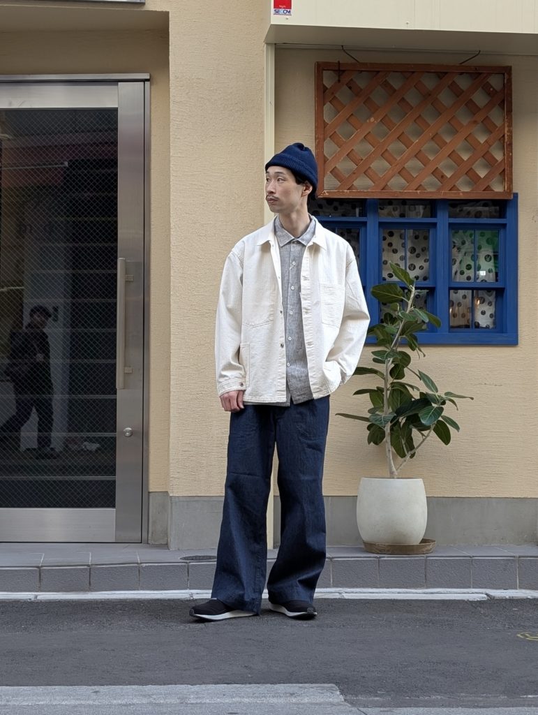 ワークウェアの無骨さと、生成り素材特有のクリーンな清涼感が同居する仕上がりです。