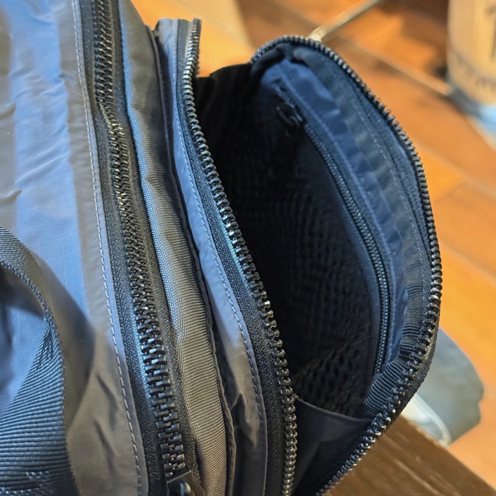 - 前ポケットにスマートフォンなどが入れられるパッド入りポケットとメッシュファスナーポケット