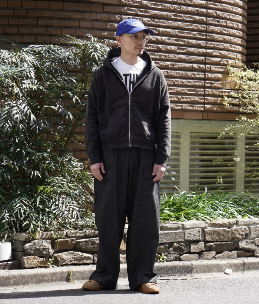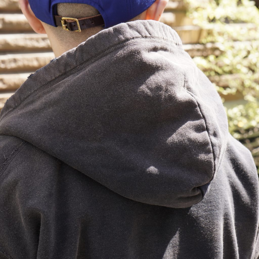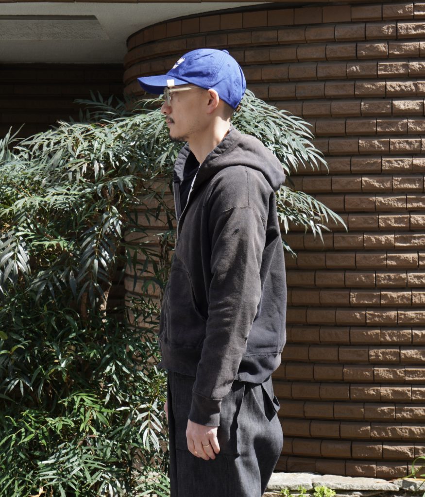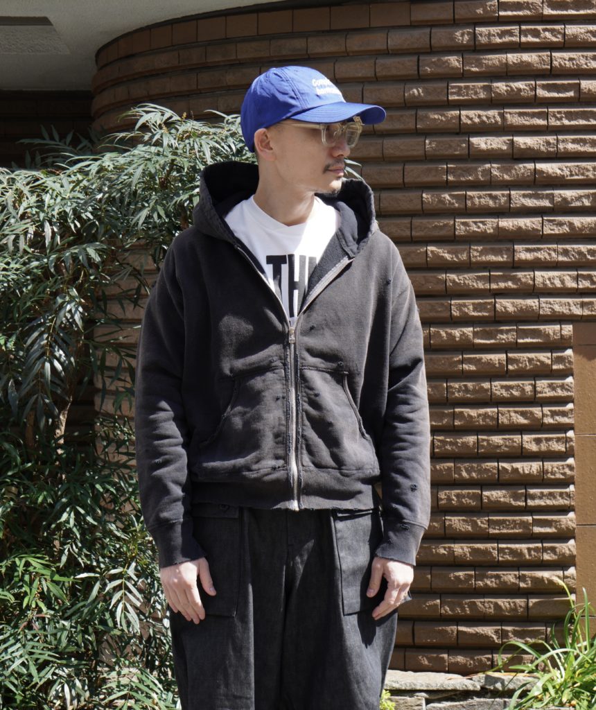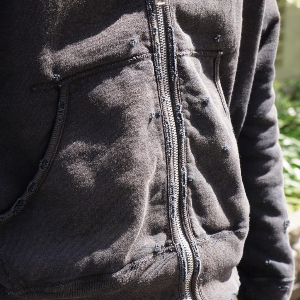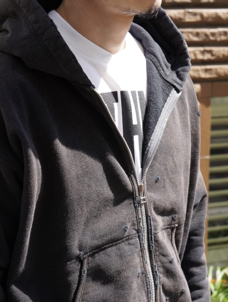 オリジナルで編み立てたライト裏毛に、独自の染色とフェード加工、ダメージを施した、concauseを代表するフーディ。