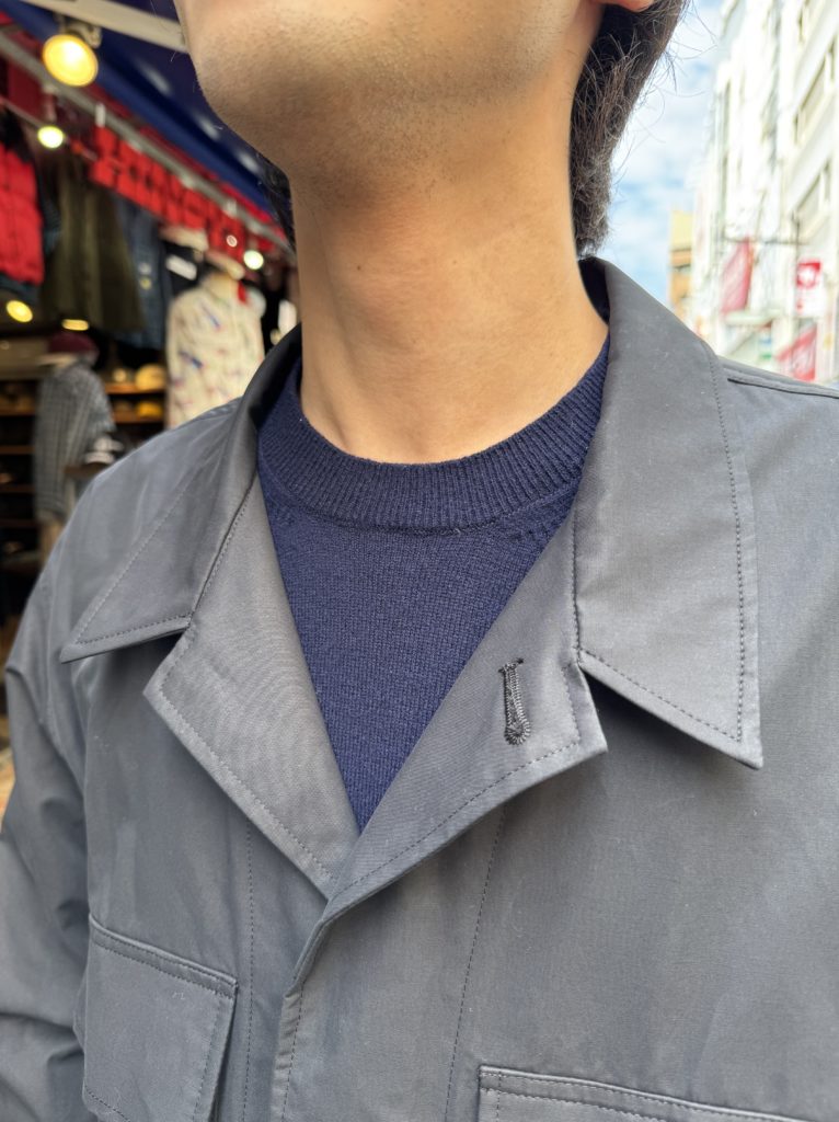 立ち上がりの美しい襟と、すっきりとした前立てラインが全体を引き締めます。