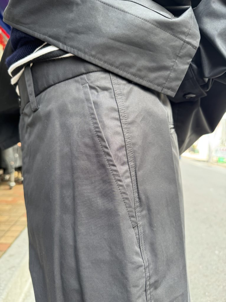 腰まわりから脚にかけてのラインを細かく調整し、リラックス感と端正さを両立しました。